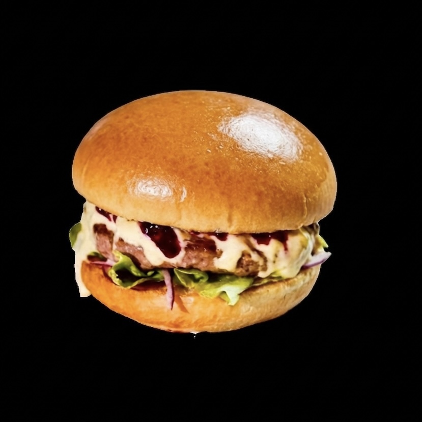 Пышная булочка бриош. Брусничный конфи. Котлета 100% говядина. Хрустящий лист салата «фрили». Ялтинский лук. Британский сыр «Чеддер»